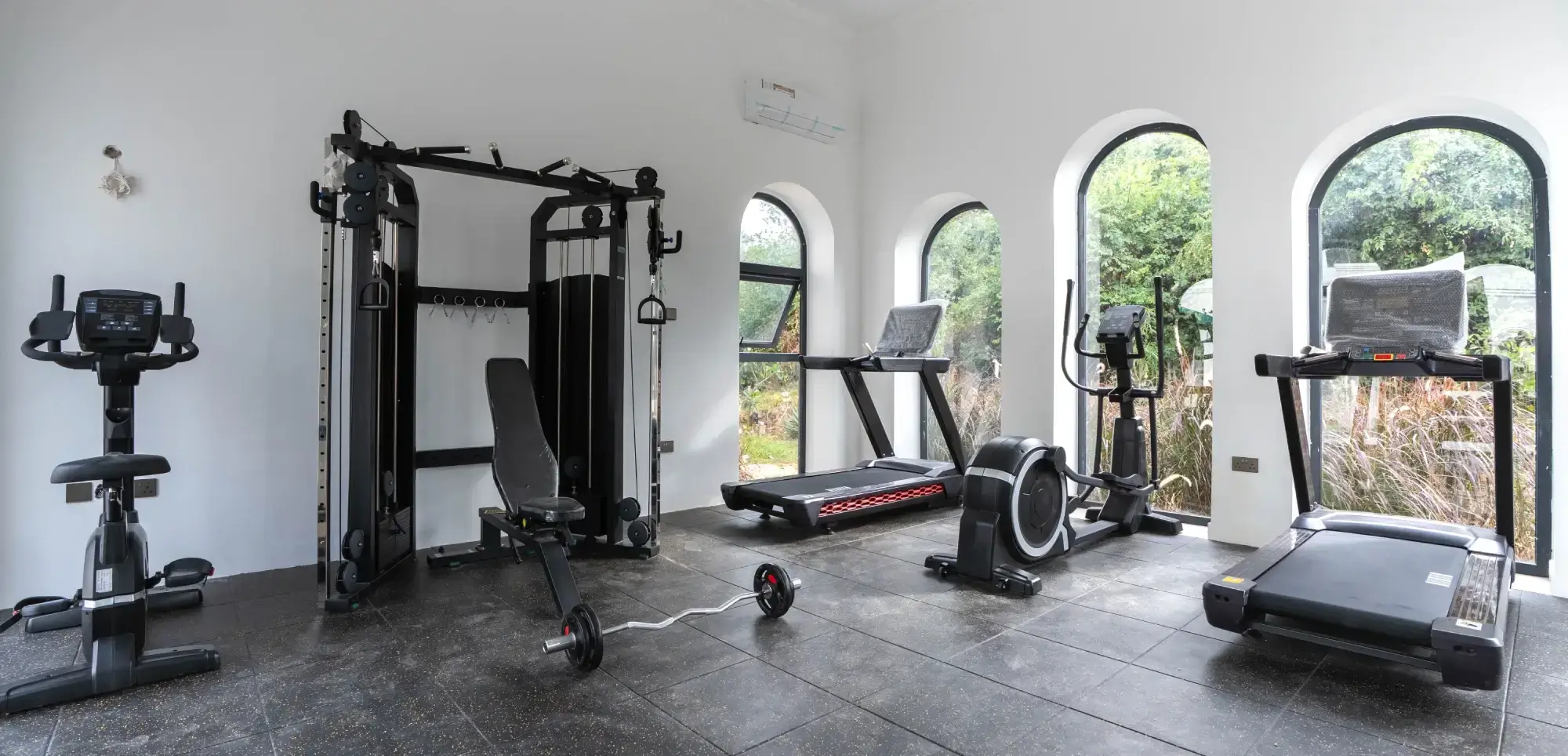 Fully equipped with treadmills, exercise bikes, and free weights for a complete workout experience.