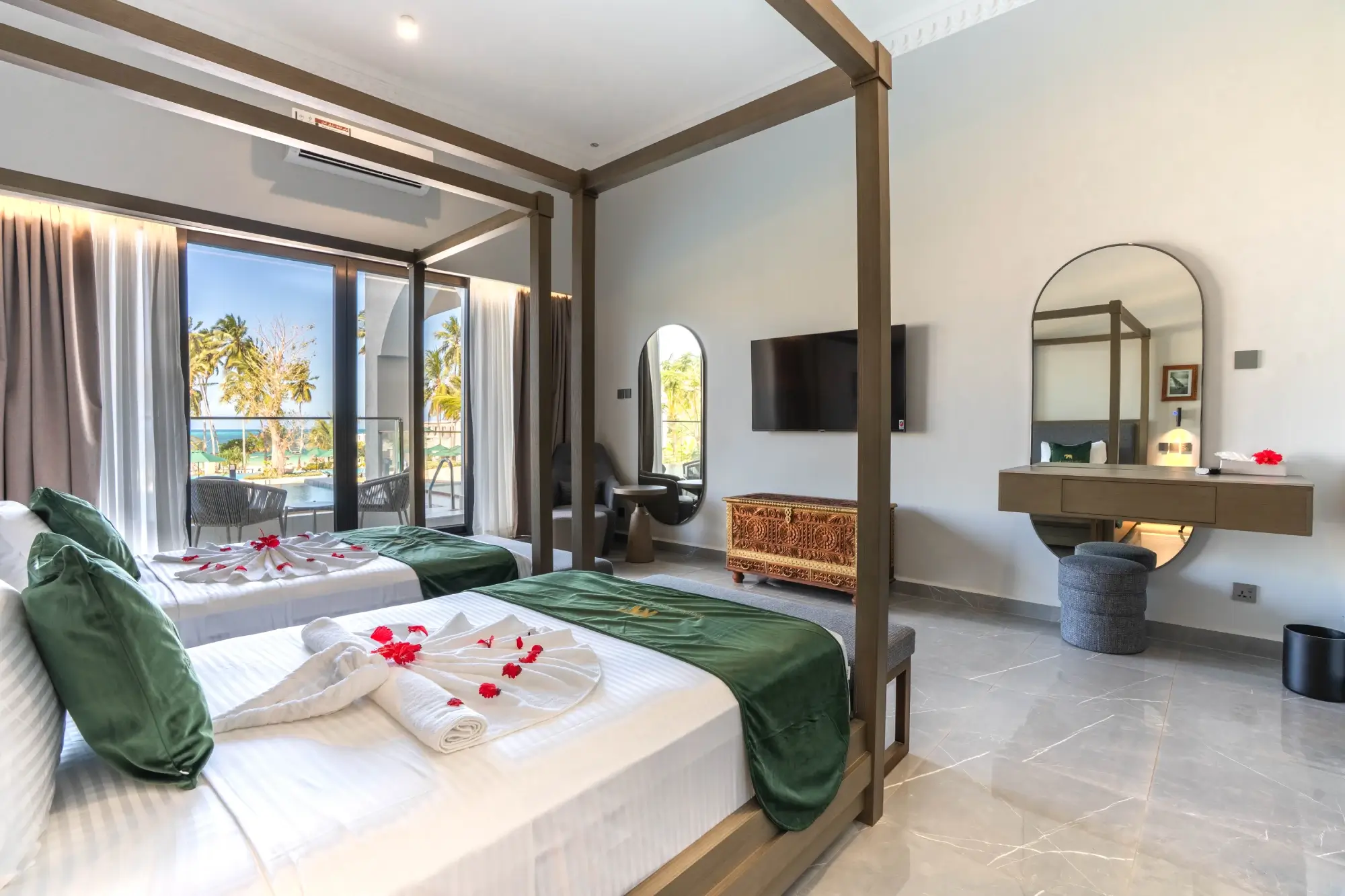 Wake up to the gentle sound of the ocean and enjoy direct access to your own private walk-in pool from the comfort of a sunlit patio. This refined twin room is thoughtfully designed with two comfortable beds, contemporary amenities, and a tranquil atmosphere — perfect for friends or family seeking a relaxing coastal escape with a touch of luxury.